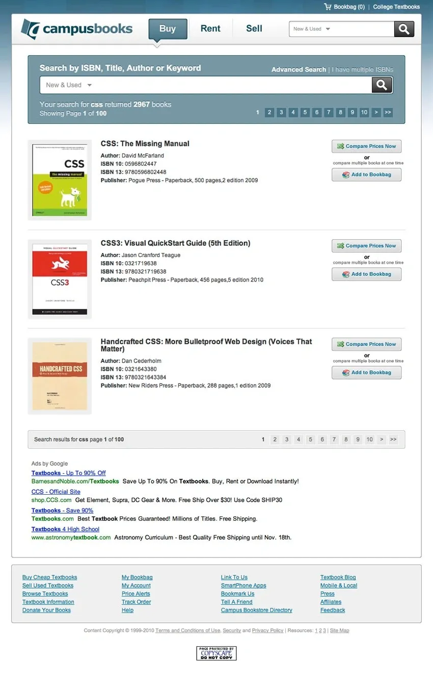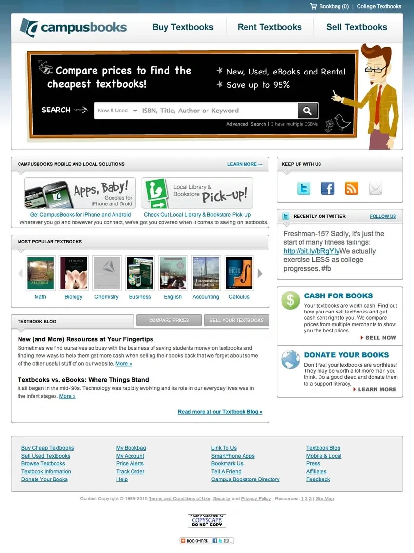 Campus Books is a leading online source for finding the cheapest prices on college textbooks. I have worked with them for several years to design and develop the interface that sits on top of their powerful price aggregation engine.