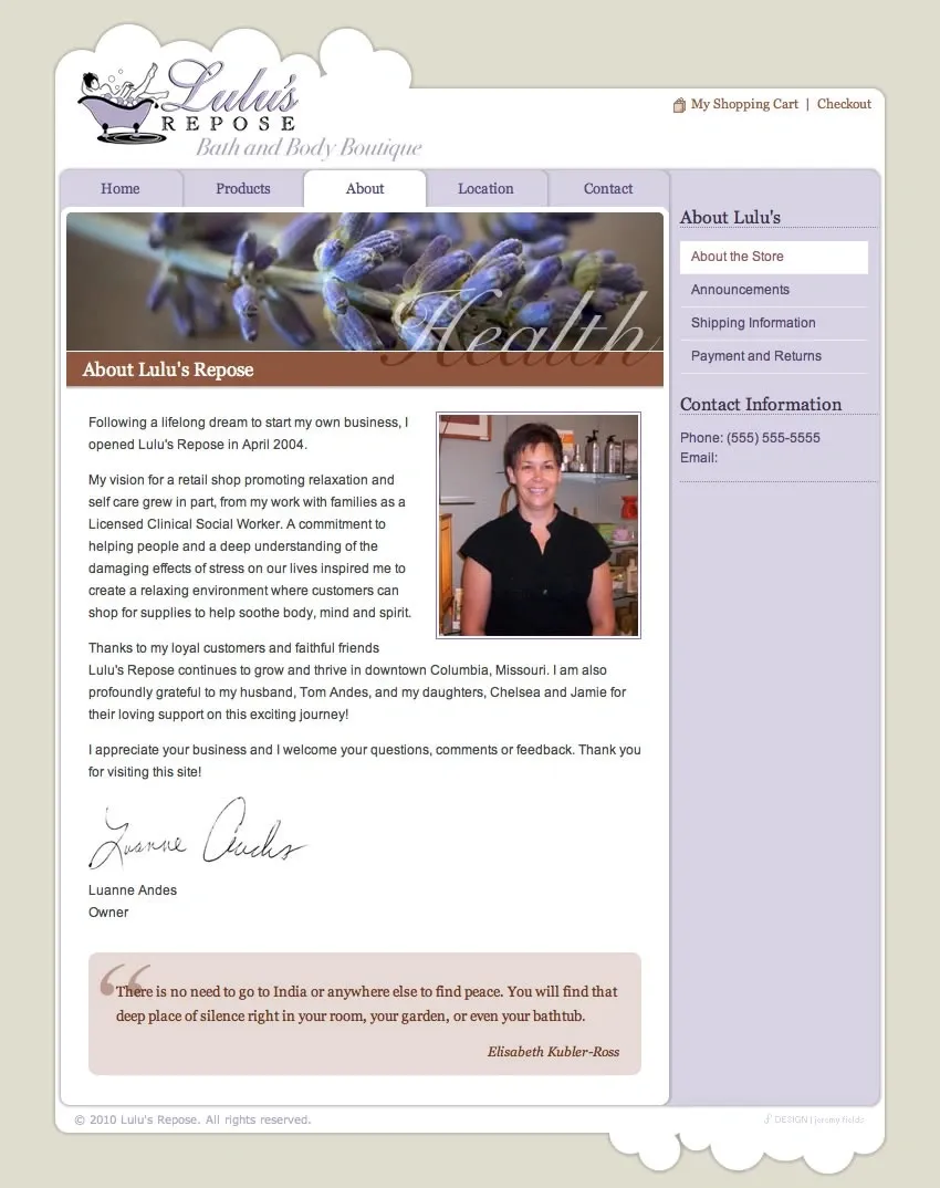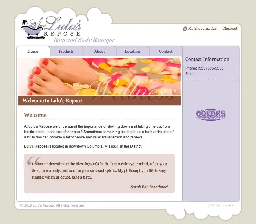 Lulu's Repose, now closed, was a bath and body boutique shop located in Columbia, MO. I designed and built an e-commerce shop that allowed them to display and sell their inventory online.
