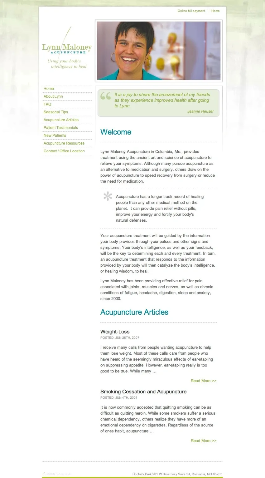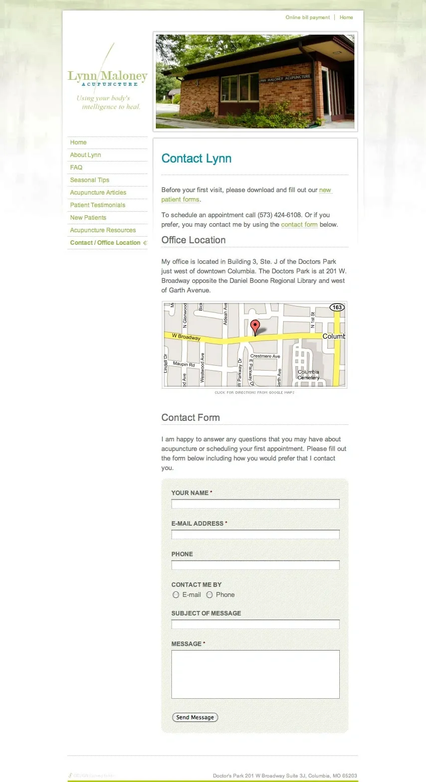 Lynn Maloney has an independent acupuncture practice in Columbia, MO. I designed and built an informational site that describes her services and what potential clients can expect. Logo by Greg Ring.