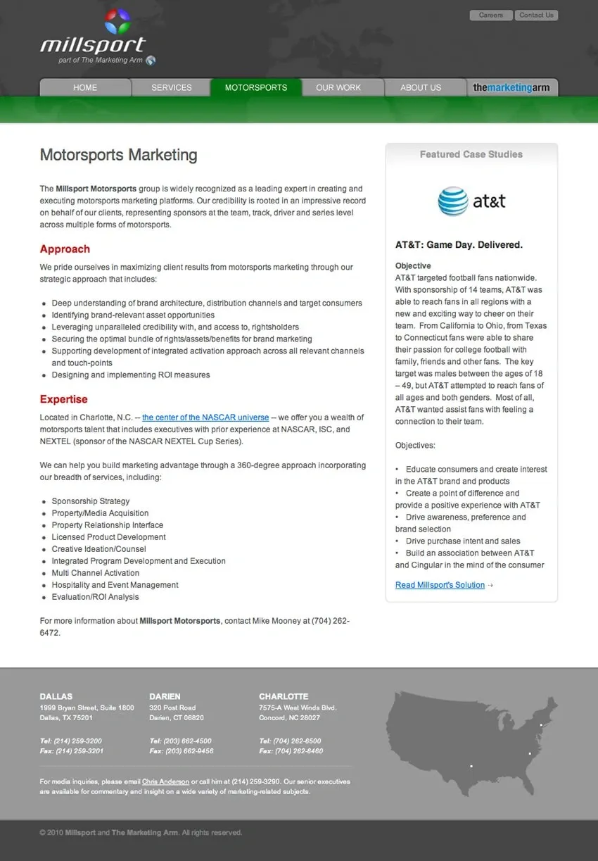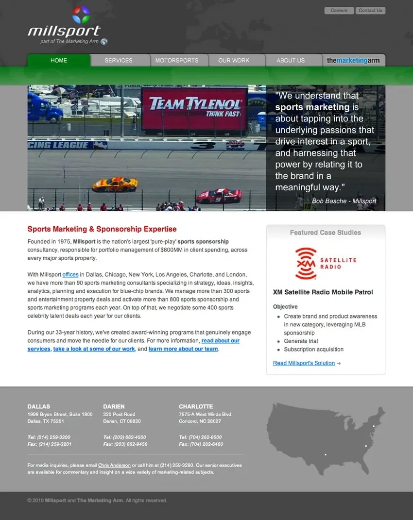 Millsport, a branch of The Marketing Arm, is a sports sponsorship consultancy with three locations throughout the US. I designed and built a site that not only features their own unique content but also taps into the database of their parent company to ensure that the content is always up to date.