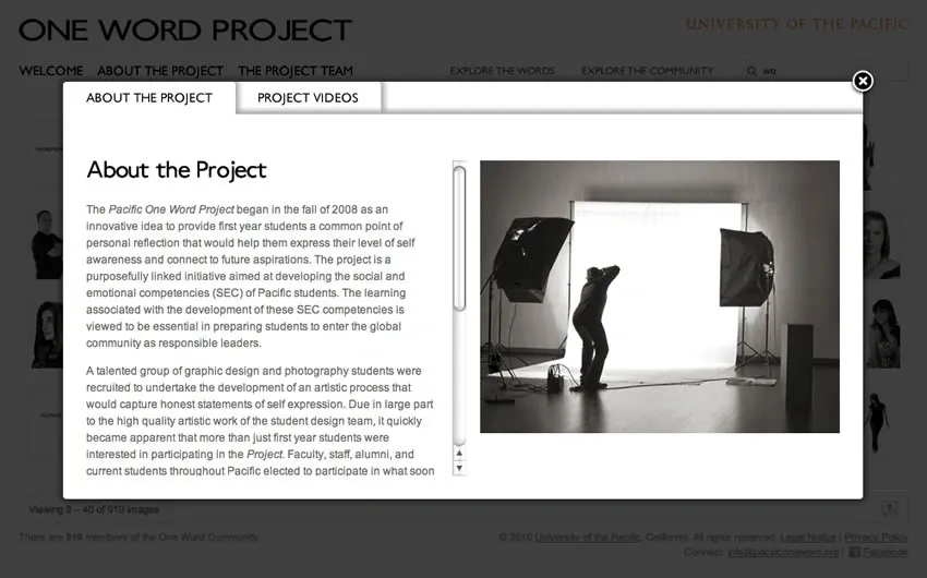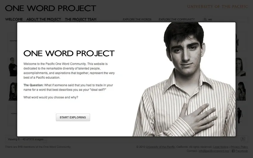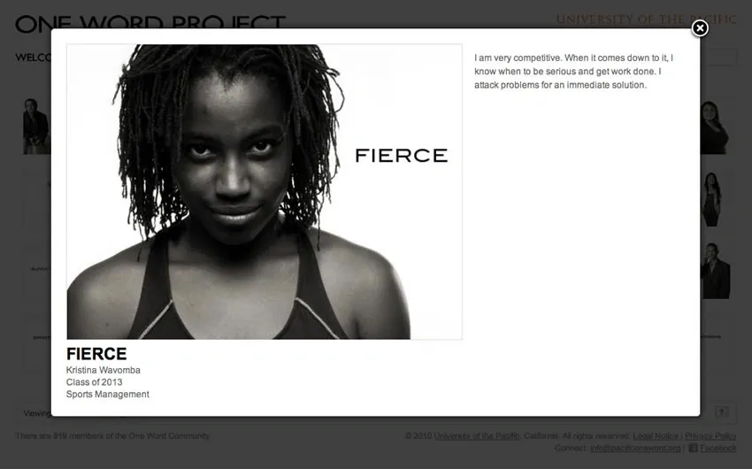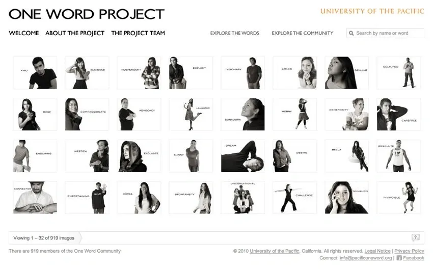 The Pacific One Word Project is an innovative experience for first-year students at the University of the Pacific that challenges them to choose a single word that defines them. I designed and built a site that allows a visitor to browse and search through the diverse community of images. I also built a content management system that easily allows tens and sometimes hundreds of images to be added at once.