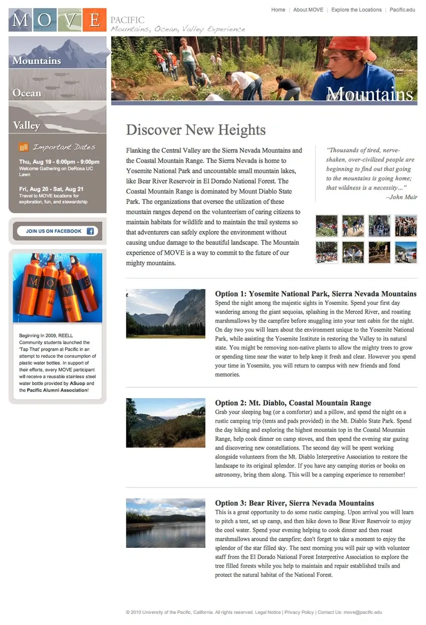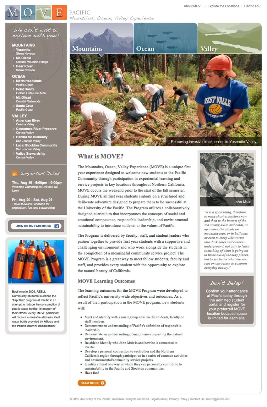 The University of the Pacific's MOVE (Mountains, Ocean, Valley Experience) is a first year experience designed to welcome new students through participation in experiential learning and service projects in locations throughout Northern California. My task was to design and build a site that helps students choose between the various projects. Logo by Ben Harben.