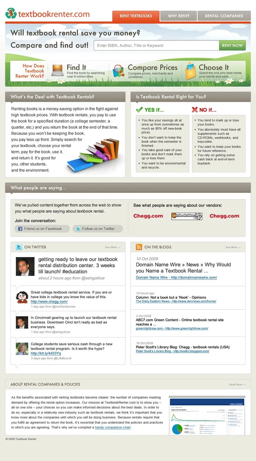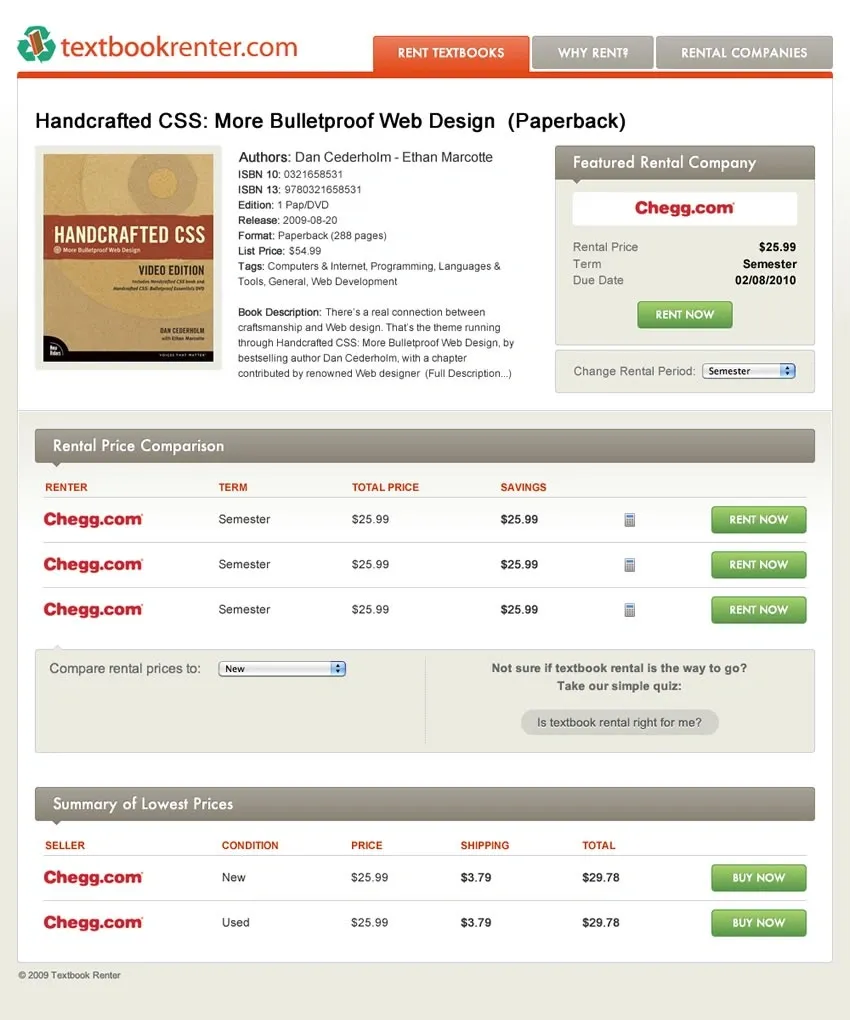 Textbook Renter, part of Campus Books and now folded into the main site was a site built on the Campus Books textbook price aggregation engine focused on rental. I designed and developed the interface to educate students about the benefits of textbook rental and allow them to search for the best prices and terms.