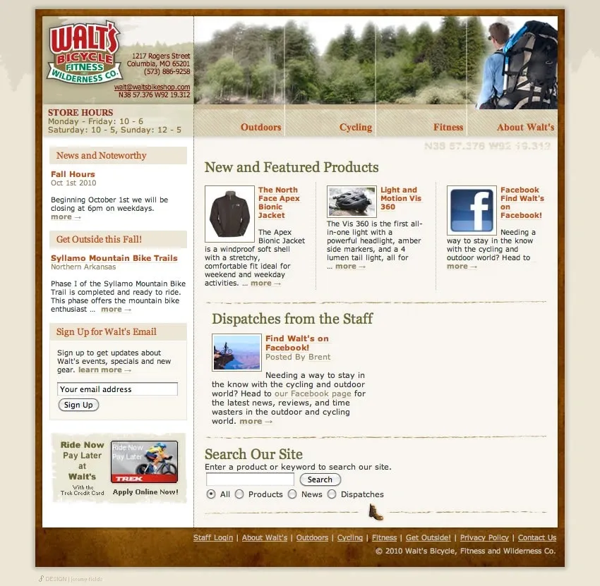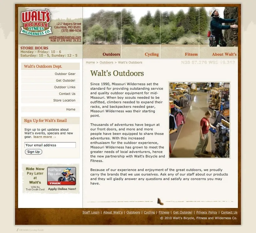 Walt's Bike Shop is an independent retail shop in Columbia, MO that specializes in high-quality outdoor equipment. I designed and built a site that not only provides information about the store and inventory but allows the staff to write trip reports and product reviews as a display of their experience and expertise.